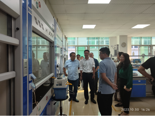 10月31日下午,调研组一行前往中山大学化学工程与技术学院学习交流,中山大学化学工程与技术学院党委书记田宝才热情接待了隋亦可一行,并陪同参观了学院的公共仪器平台、教学实验室、科研实验室以及教职工活动室。