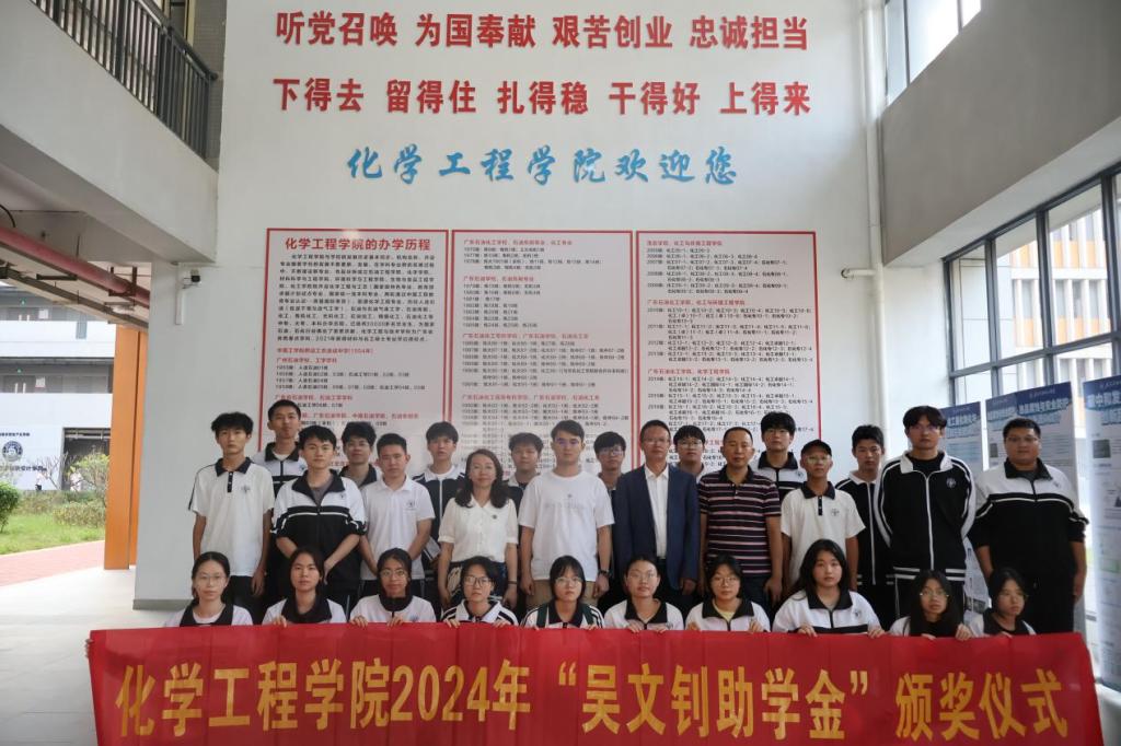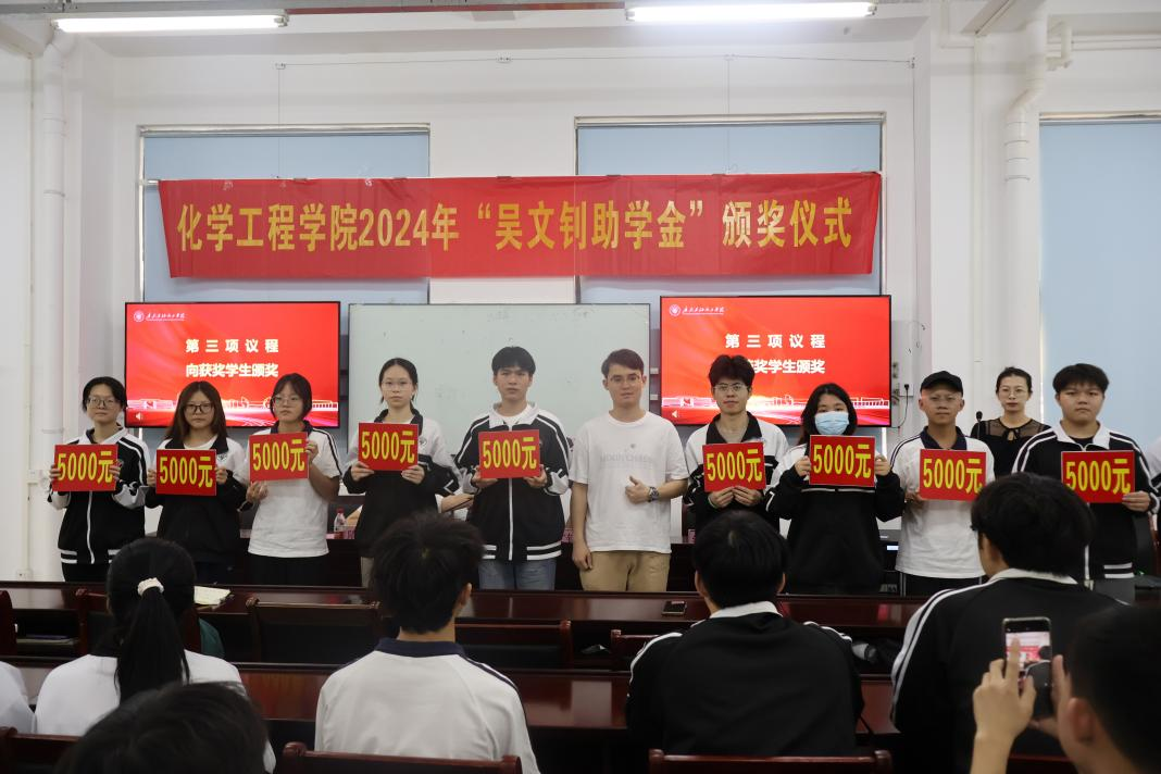 11月11日下午,化学工程学院在化工C104隆重举行“吴文钊助学金”颁奖仪式,出行本次会议的嘉宾有广东禾富传媒有限公司总经理吴文钊、党委书记隋亦可、院长余长林、党委副书记纪玉刚及获奖学生。