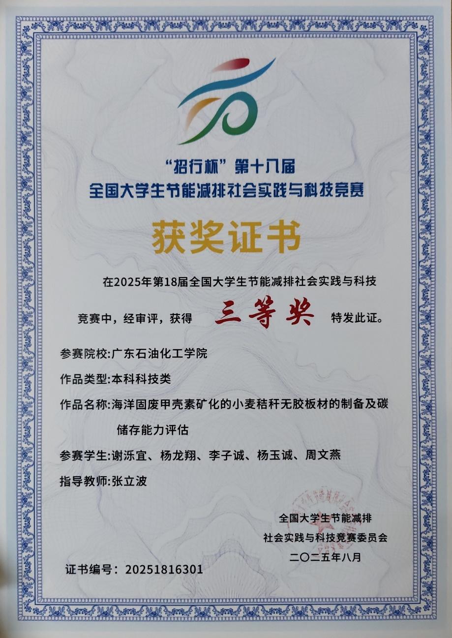 近日,全国大学生节能减排社会实践与科技竞赛决赛在东北石油大学闭幕,化学工程学院学生谢泺宜团队(成员:杨龙翔、李子诚、杨玉诚、周文燕;指导教师:张立波)的作品《海洋固废甲壳素矿化的小麦秸秆无胶板材的制备及碳储存能力评估》荣获本科科技类项目三等奖。