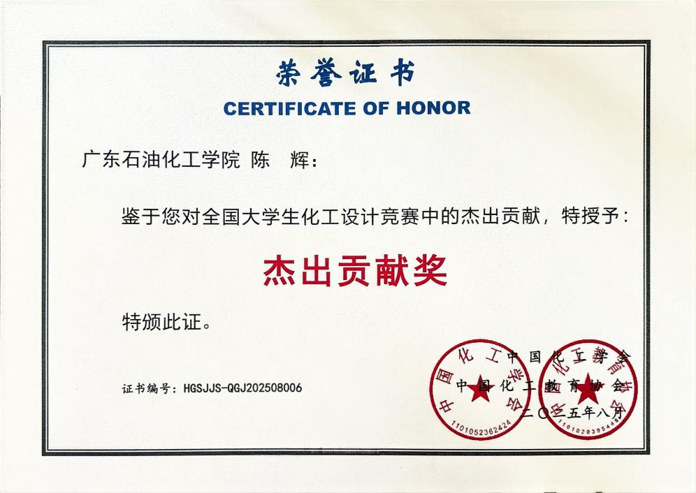 基于在化工教育领域的卓越贡献,陈辉教授还获得了多项重要荣誉:他于2018年获得广东省“南粤优秀教师”、2019年被教育部授予“全国优秀教师”称号,2020年荣获广东省授予的“广东省劳动模范”,2023年荣获“广东省劳模与工匠创新工作室”等荣誉。